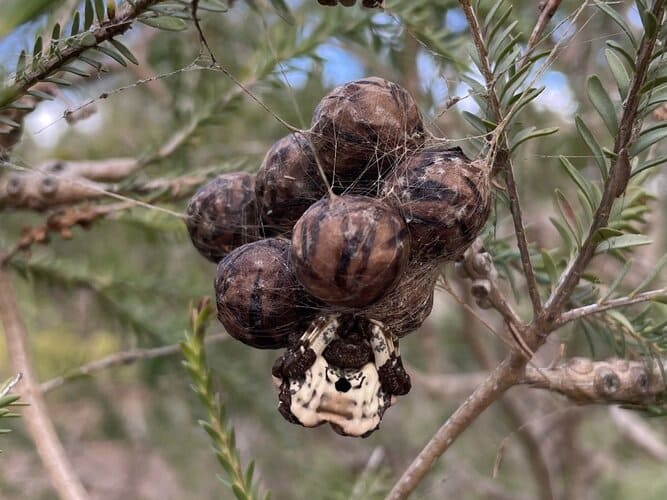 Reproduction: females hang multiple globose/pear‑shaped egg sacs on twigs, camouflaged with silk/debris.