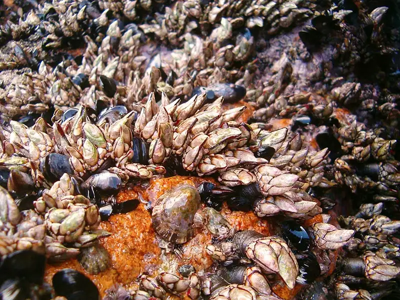 Wave‑exposed rock attachment; cirral suspension feeding; dense clusters; high culinary value under strict regulation.
