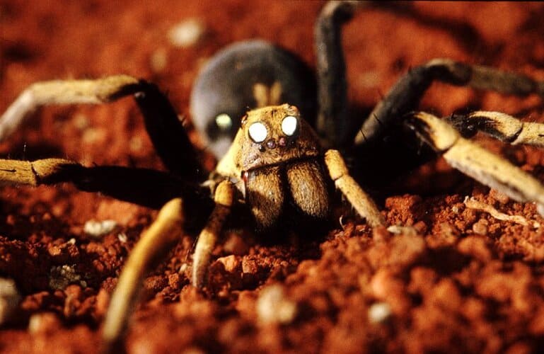 When illuminated by a torch at night, the large central pair of eyes reflects light strongly, so wolf spiders often appear as tiny shining points on the ground.