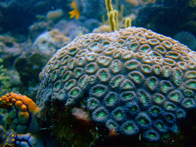 Massive/sub‑hemispherical colonies with plocoid corallites; brown/green/yellow‑green hues, often fluorescent rims; fine night tentacles.