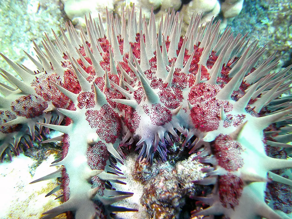 Many‑armed with venomous spines; coral specialist; very high fecundity; capable of damaging outbreaks.