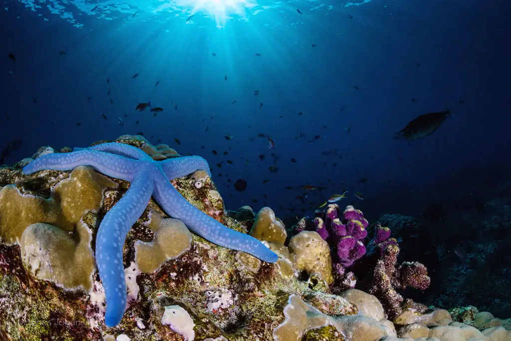 Linckia laevigata—the blue sea star—is an ophidiasterid asteroid conspicuous on tropical Indo‑Pacific reefs. It is best known for its vivid blue coloration (purple/green/brown or mottled morphs occur) and its remarkable ability for arm autotomy and regeneration, producing “comet” forms from detached arms.