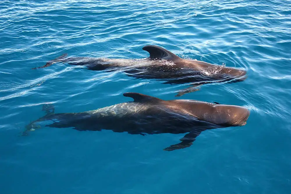 G. melas has longer flippers and occupies cooler waters; G. macrorhynchus has shorter flippers and favors tropical/subtropical seas with a taller dorsal fin.