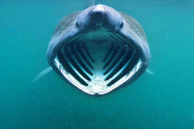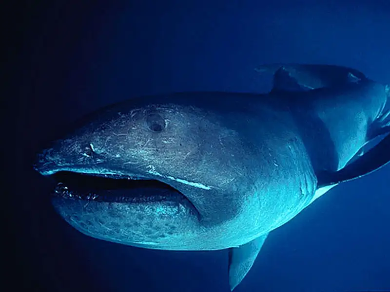 Common length 4–5.5 m (max ~7 m); huge mouth with thick, rubbery lips; short blunt snout; brown‑grey to dark dorsum and pale underside; two spineless dorsal fins. Pale mouth lining may include faint luminescent/reflective tissue (hypothesized).