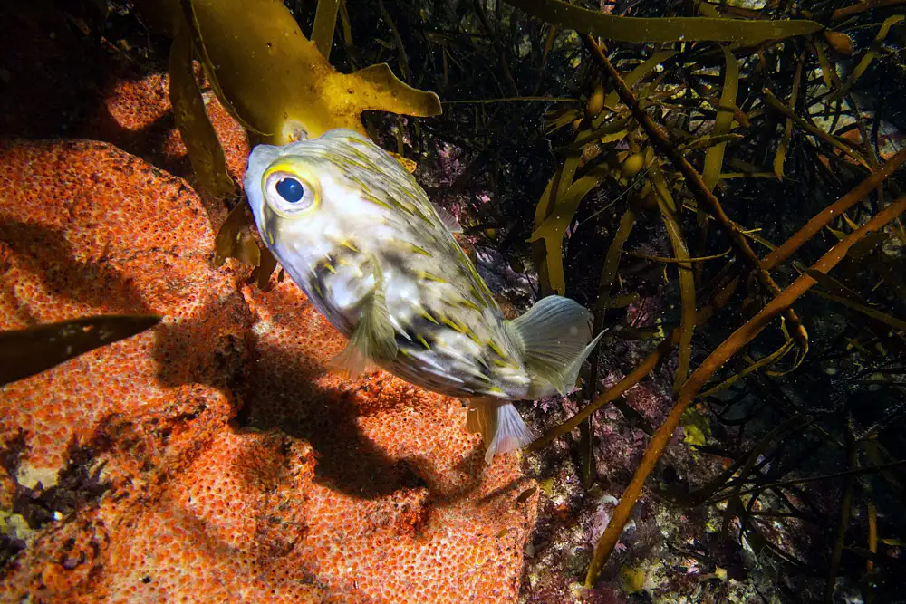 Inflation defence; slender recumbent spines; beak‑like dental plates crush hard‑shelled prey; temperate nearshore habitats.